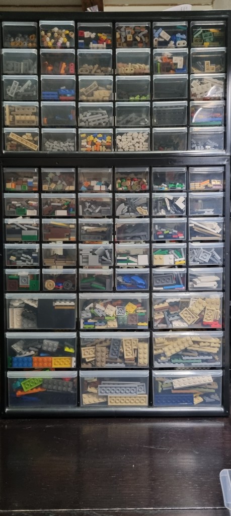 Voilà un truc sympa, qui suivant les personnes sera totalement différent. Chacun sa façon de faire, moi je change souvent, c’est des fois par couleurs, mais souvent par idées ou forme. Par idée c’est à dire que je mets des pièces qui ont une utilisation commune comme des charnières ou tout ce qui sert à la bouffe au départ etc. Ça peut paraitre étrange mais c’est propre à chacun l’organisation !