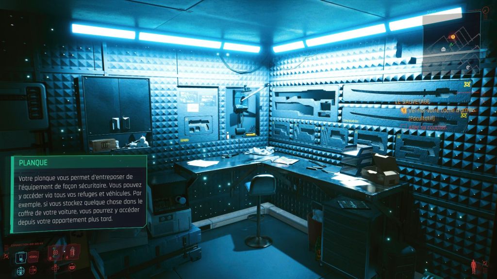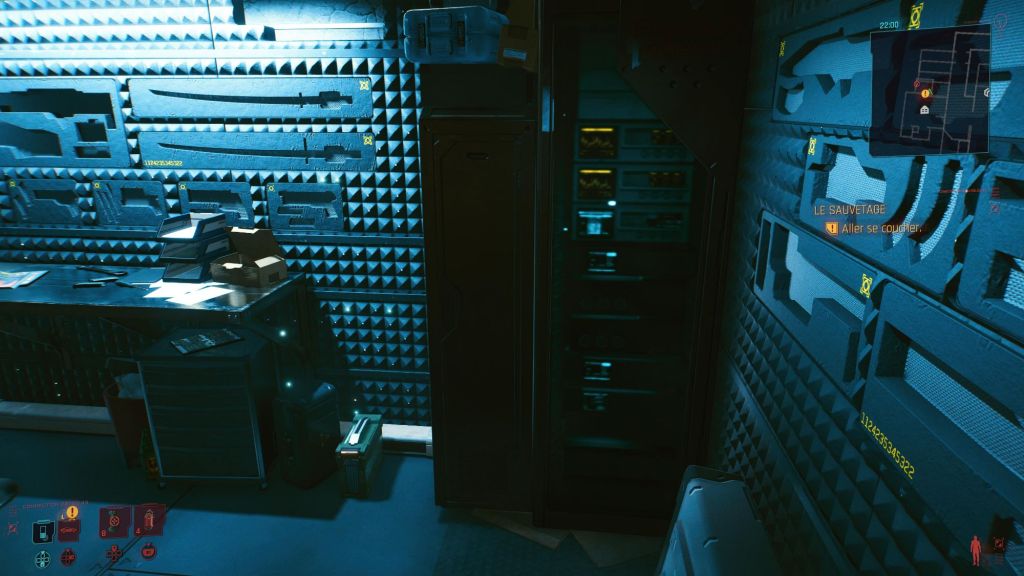 La penderie, le canapé en forme de U avec la table au centre et la TV en haut, le bureau avec le PC, la salle d’arme, le lit, le distributeur, la porte coulissante de l’armurerie et celle d’entrée, le ventilo, la salle de bain avec douche et toilette, les serviettes, le miroir, le bazar qui traine etc.