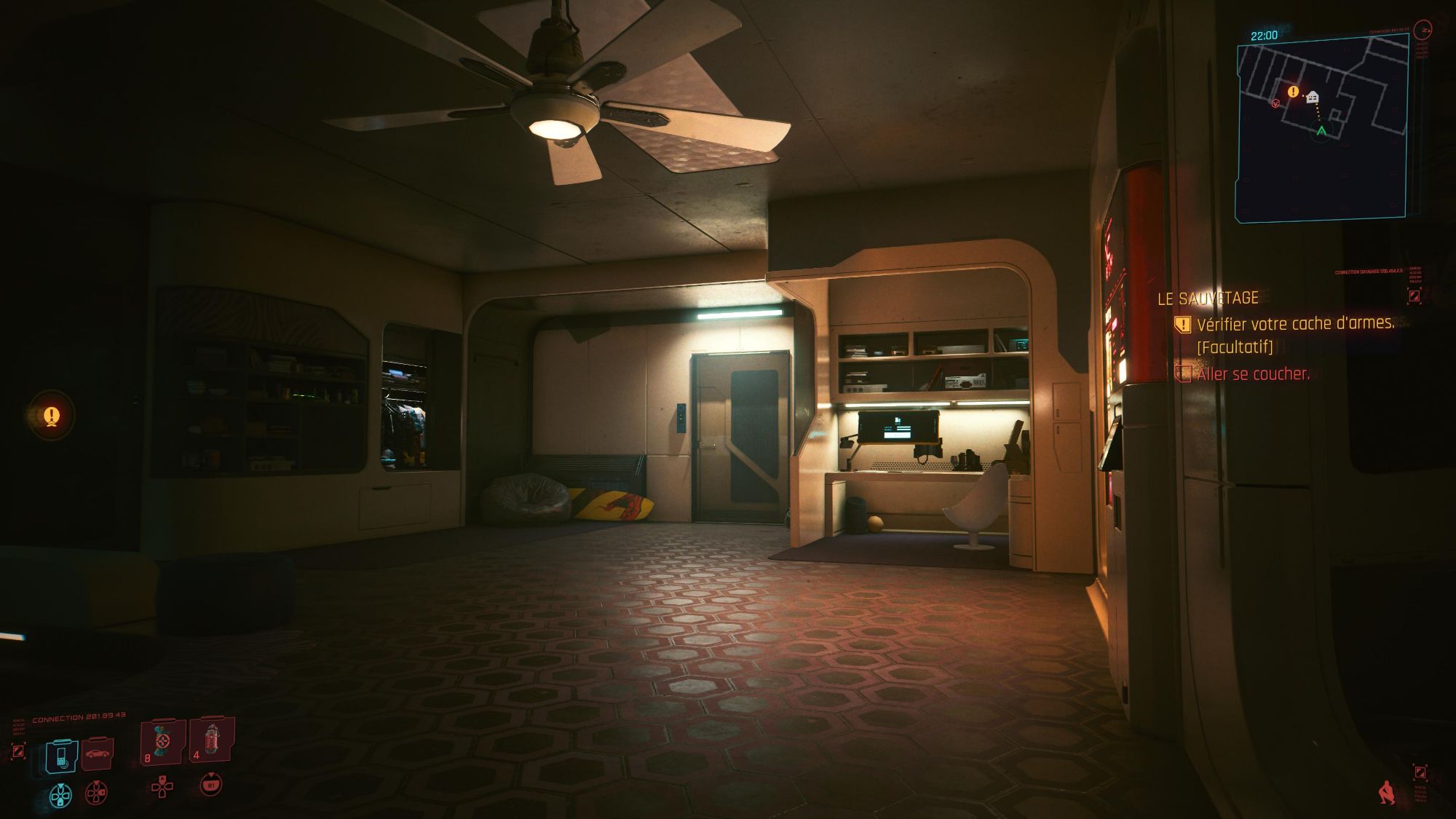 La penderie, le canapé en forme de U avec la table au centre et la TV en haut, le bureau avec le PC, la salle d’arme, le lit, le distributeur, la porte coulissante de l’armurerie et celle d’entrée, le ventilo, la salle de bain avec douche et toilette, les serviettes, le miroir, le bazar qui traine etc.
