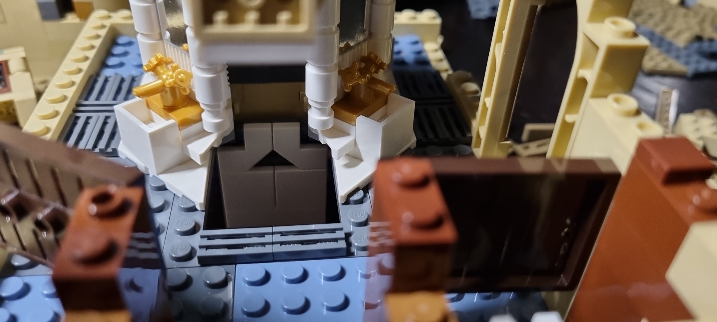 J’ai aussi des choses un peu cache misère dont je ne suis pas trop fier, mais globalement ça ne se voit pas trop vu que c’est derrière. Le sol pour cacher la chambre des secrets, ou alors certains toits qui ne sont fait que d’un seul côté vu que les photos n’en montrent qu’un ! Quand t’a plus les pièces faut être malin. Si j’avais dû exposer au public le château et qu’on puisse l’observer de tous les côtés, là c’est clair que j’aurais mis en place ce qu’il manquait. Mais c’est pour moi que je l’ai fait principalement et pour le montrer sur le net, donc c’est pas trop gênant.