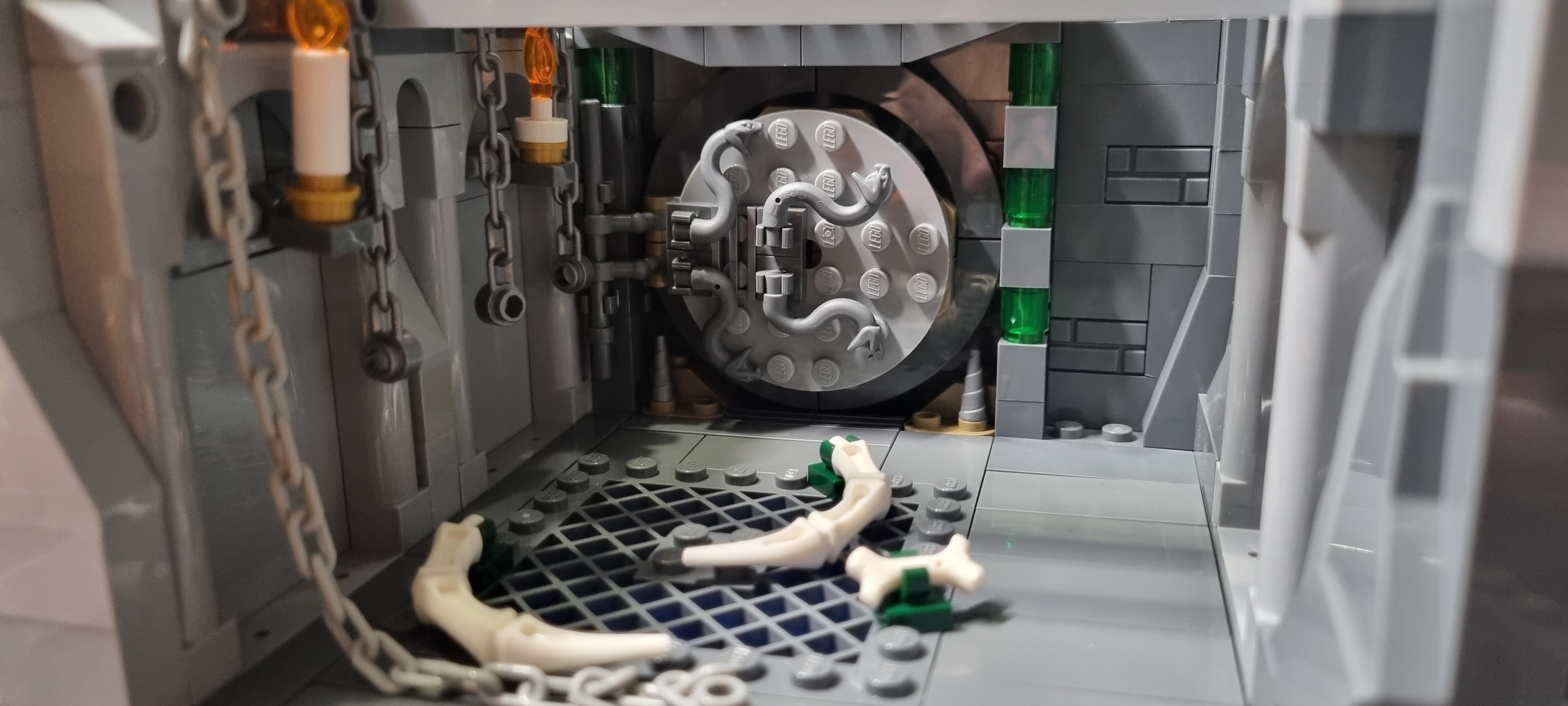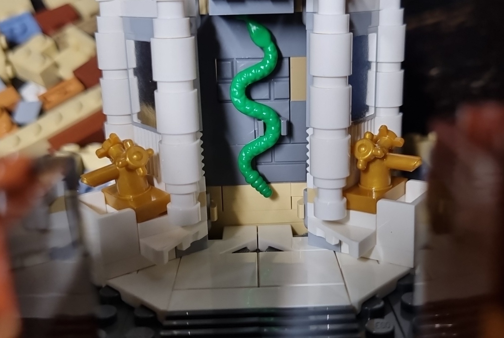 Une fonctionnalité que j’ai adoré faire mais qui était aussi très complexe pour que tout soit bien empilé c’est depuis les toilettes du RDC faire en sorte que le lavabo s’ouvre pour laisser place à l’entrée de la chambre des secrets et tomber vers l’antre du Basilisk à l’étage en dessous. Et au dessus le haut de la structure des toilettes qui se voit sur le sol de l’infirmerie. Les détails, j’aime ça, on ne les voit pas forcement, personne n’y fera attention mais moi je le sais et ça me plait !