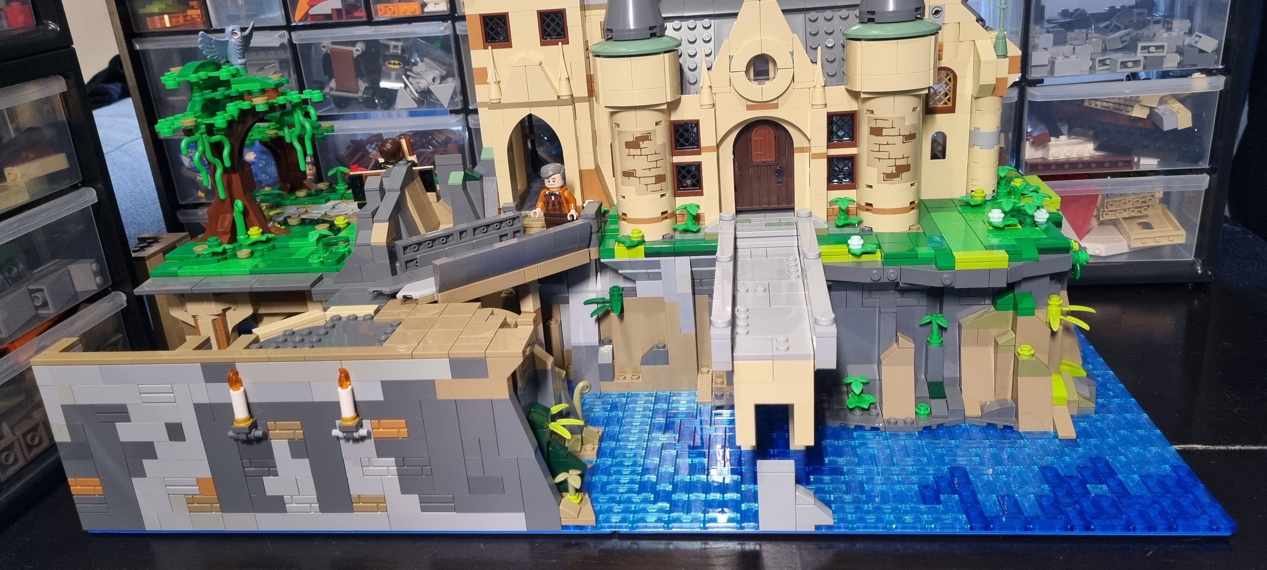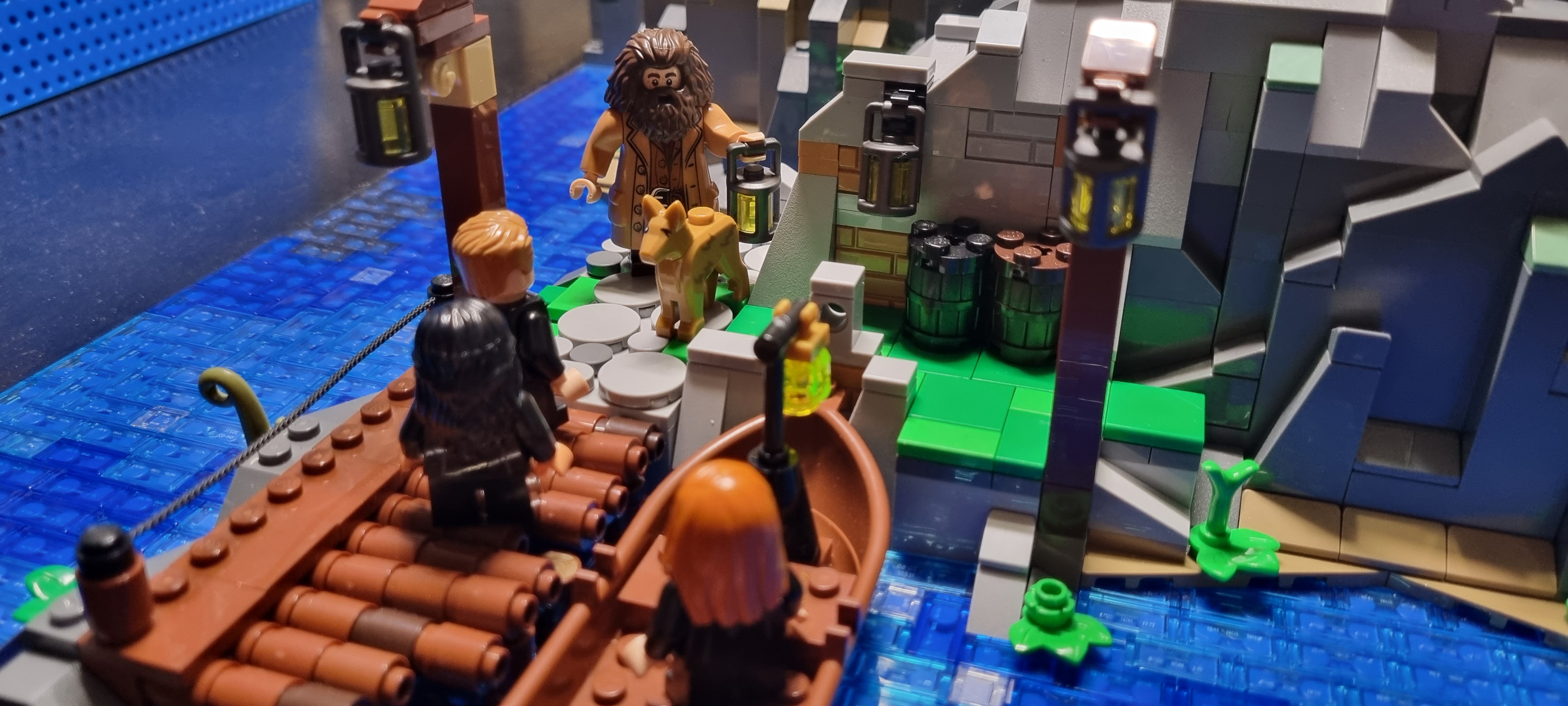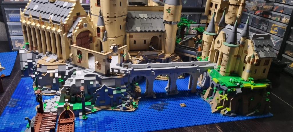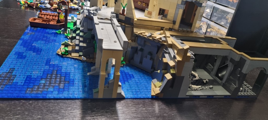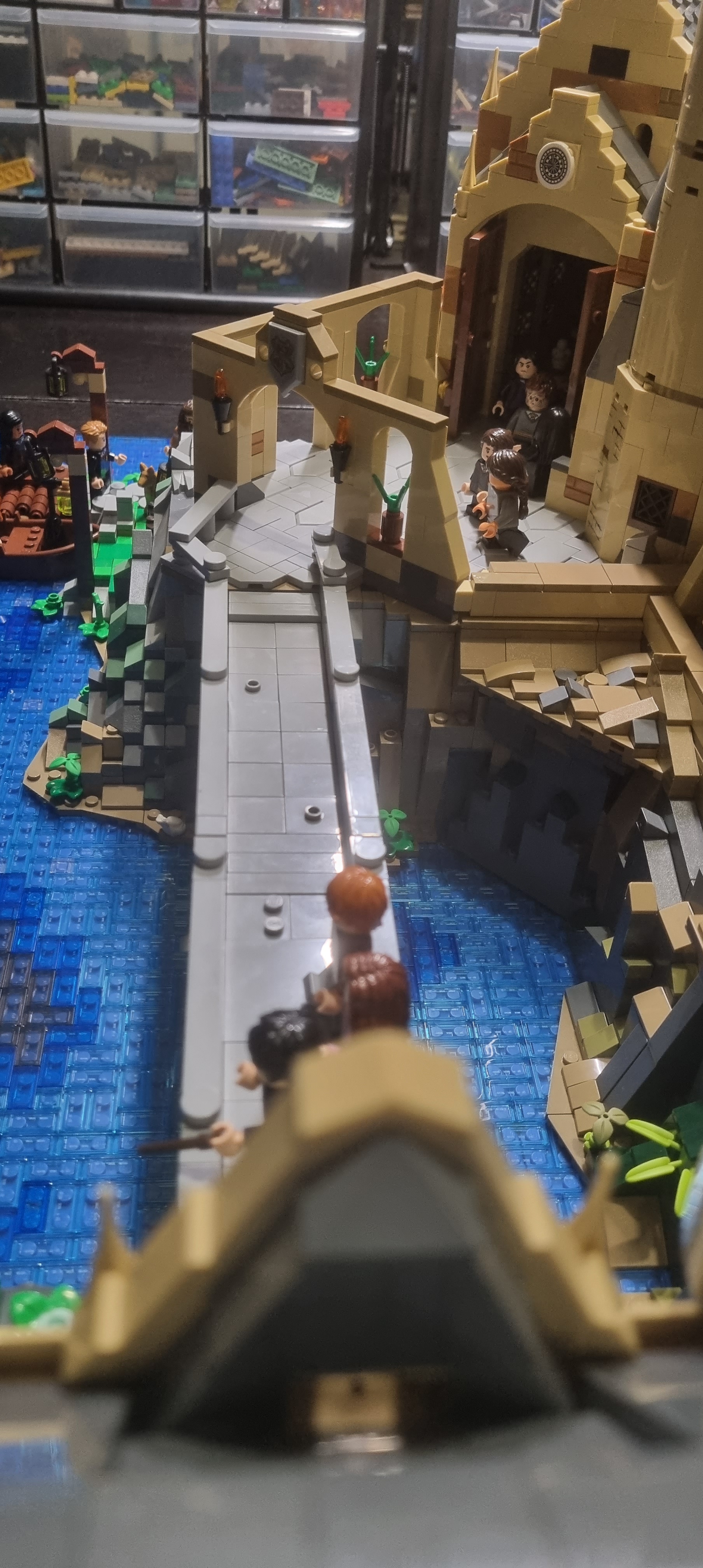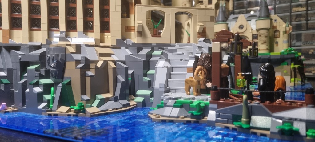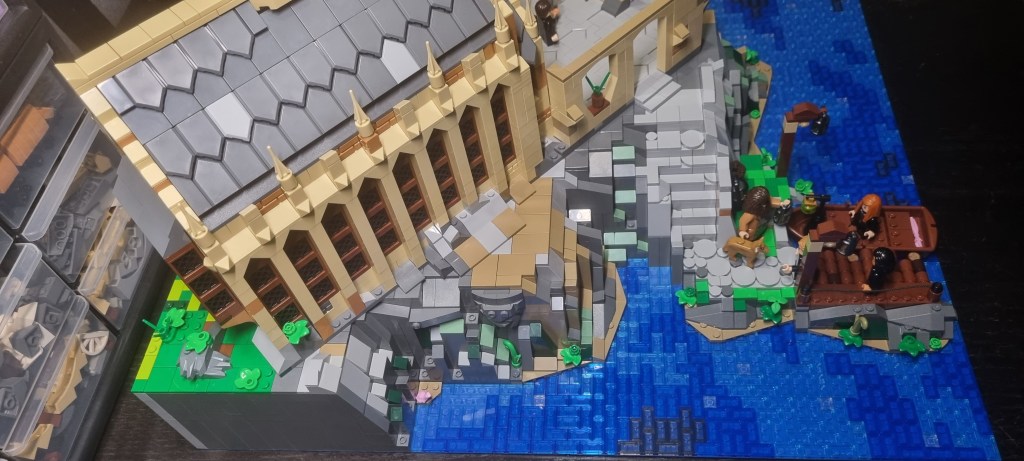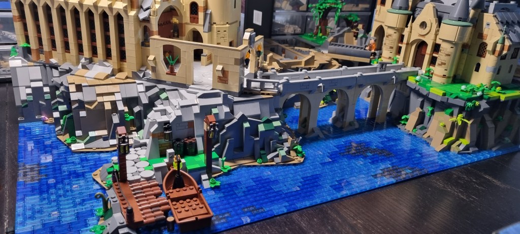Au même titre que le grand escalier, j’ai pas eu la place pour faire le hangar à bateau en bas du château. J’ai du changer pour installer un ponton avec les barques. J’avais fait quelques essais mais en terme d’échelle ça ne me plaisait pas, c’était bien trop gros par rapport au reste du set. Et puis normalement le château est bien plus haut avec tout un chemin qui descend de la cours devant le grand hall. Du coup le ponton c’est pas si mal et l’idée des élèves qui arrivent en barque est conservée ! On fait au mieux avec ce qu’on a ^^