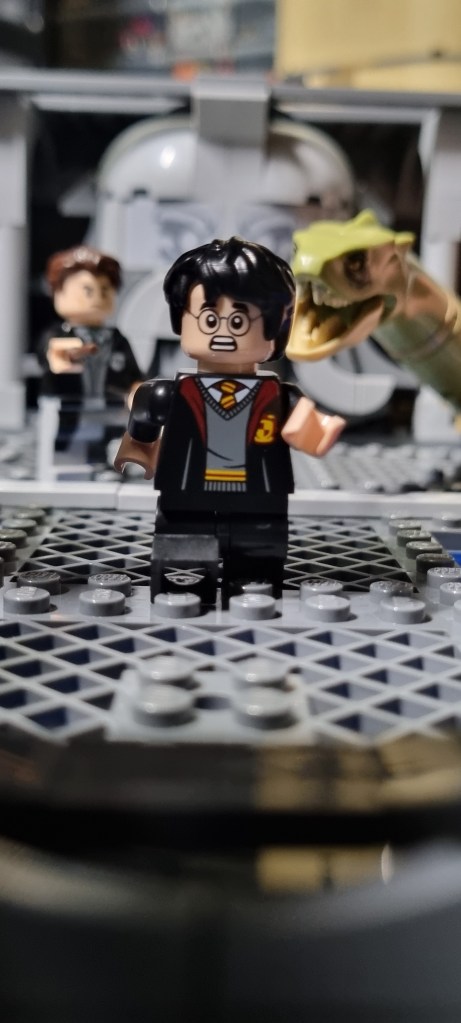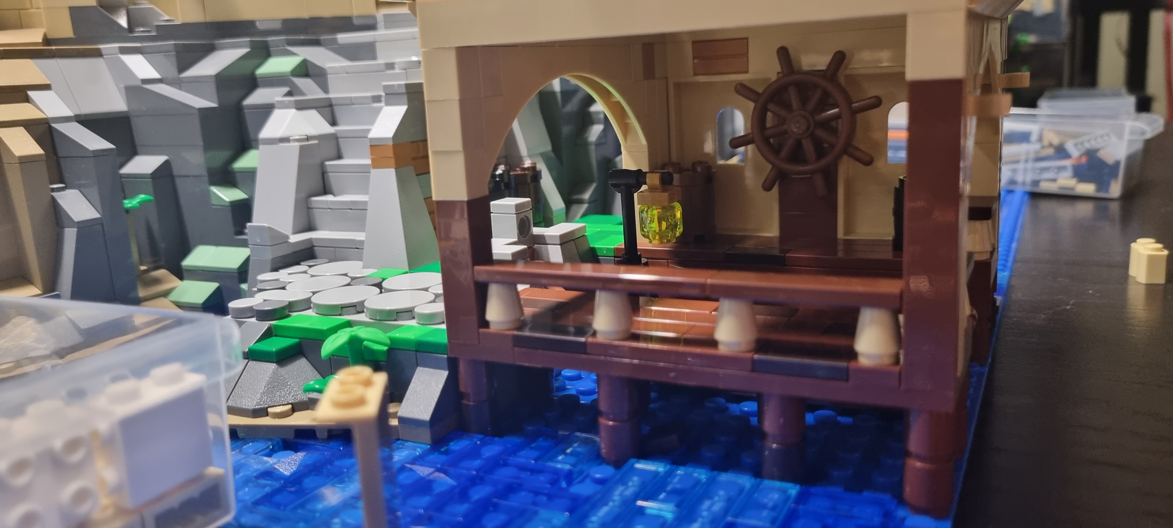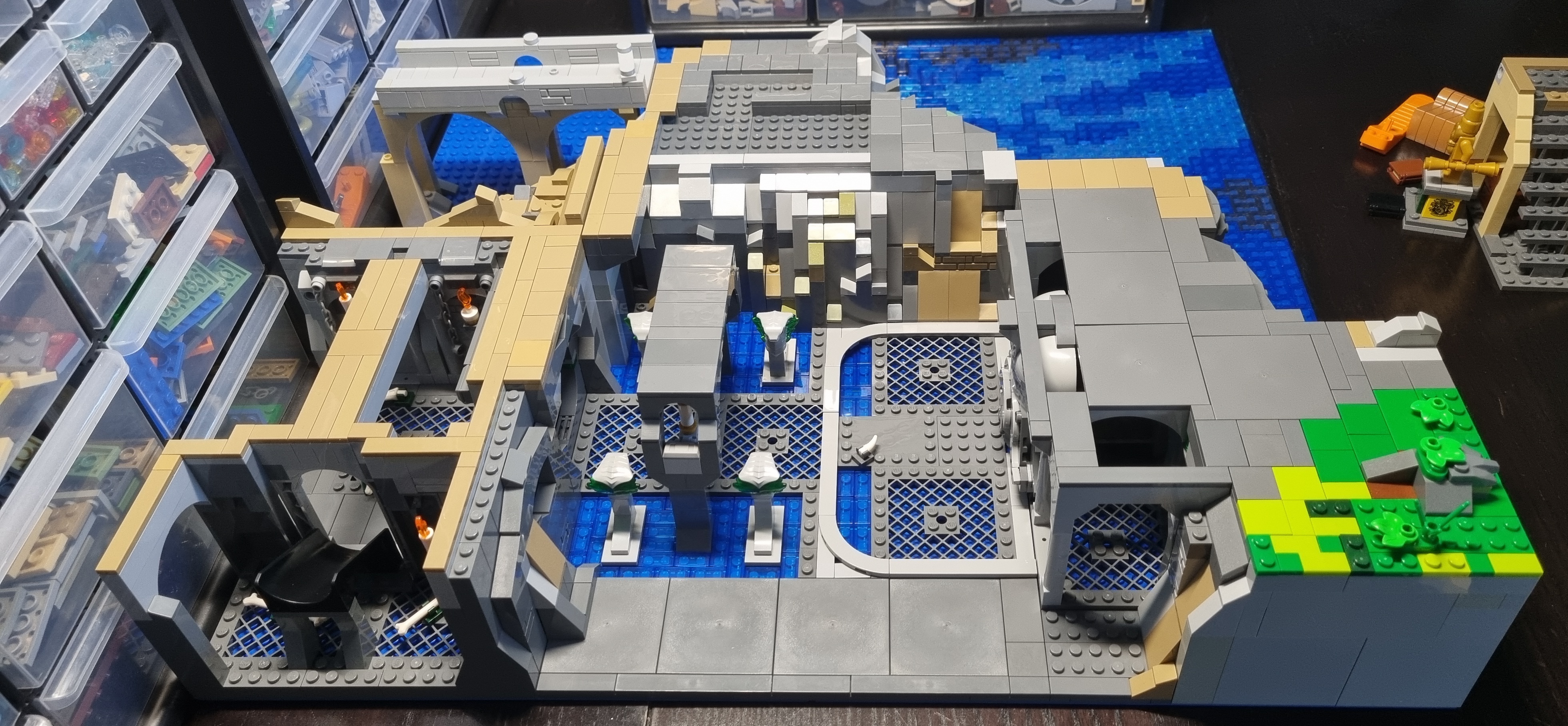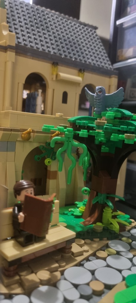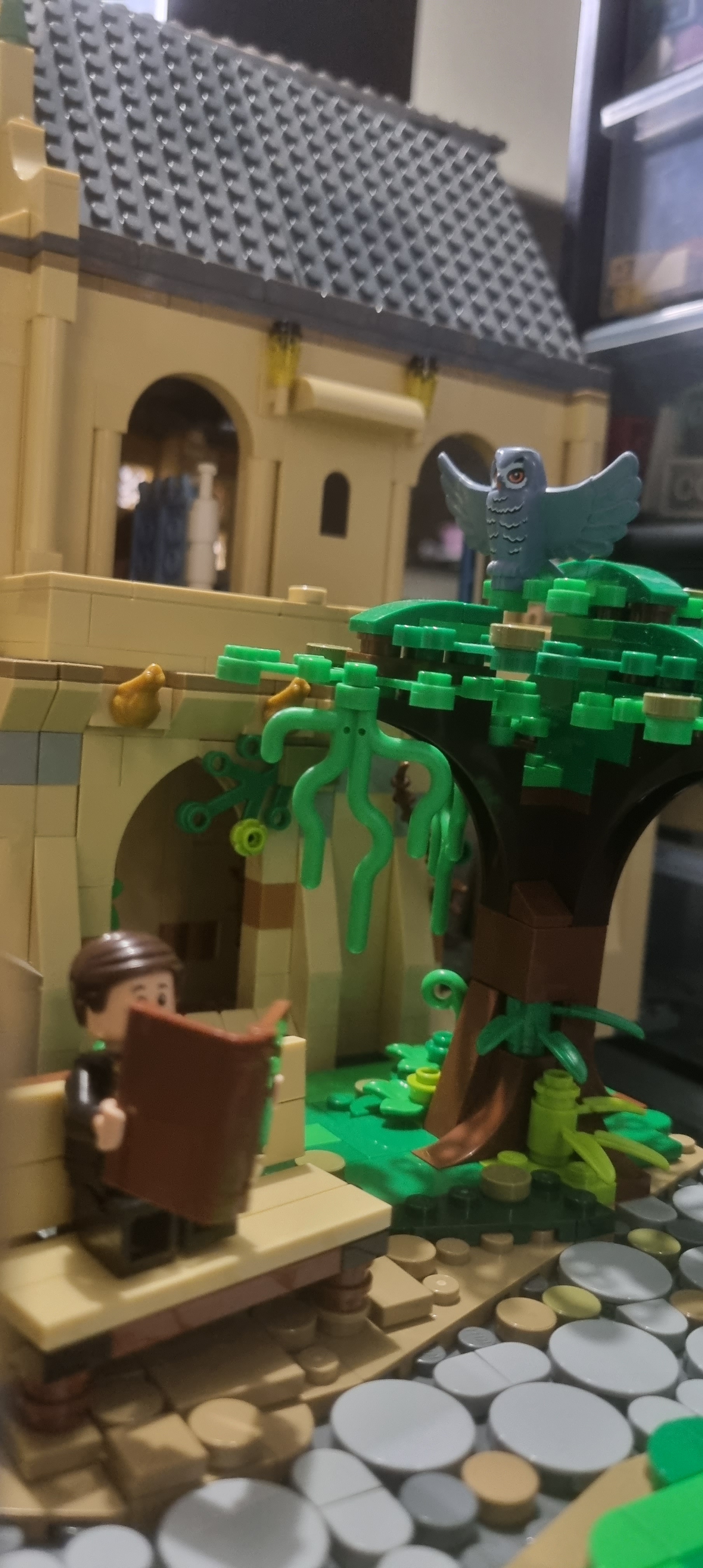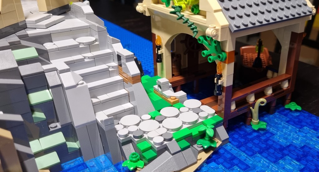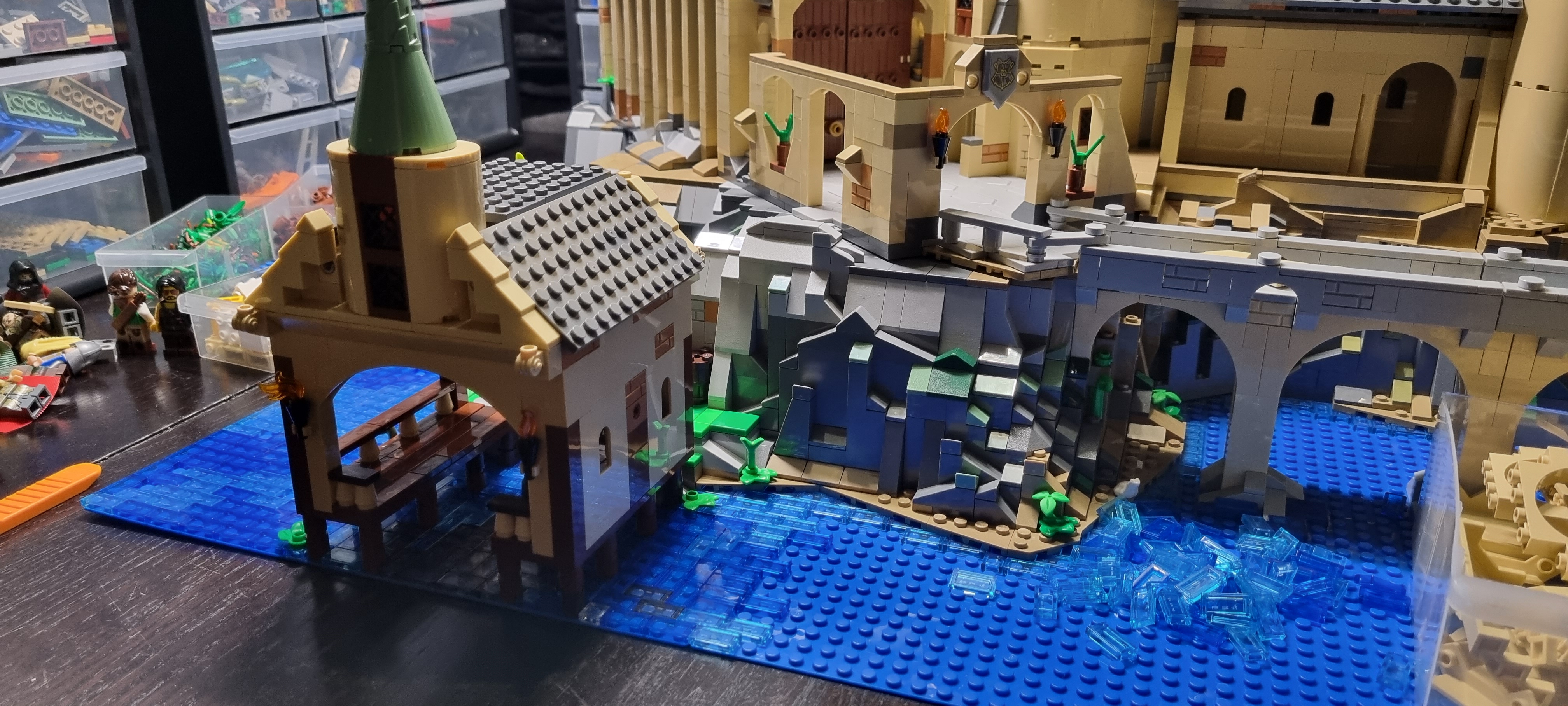 Au même titre que le grand escalier, j’ai pas eu la place pour faire le hangar à bateau en bas du château. J’ai du changer pour installer un ponton avec les barques. J’avais fait quelques essais mais en terme d’échelle ça ne me plaisait pas, c’était bien trop gros par rapport au reste du set. Et puis normalement le château est bien plus haut avec tout un chemin qui descend de la cours devant le grand hall. Du coup le ponton c’est pas si mal et l’idée des élèves qui arrivent en barque est conservée ! On fait au mieux avec ce qu’on a ^^
