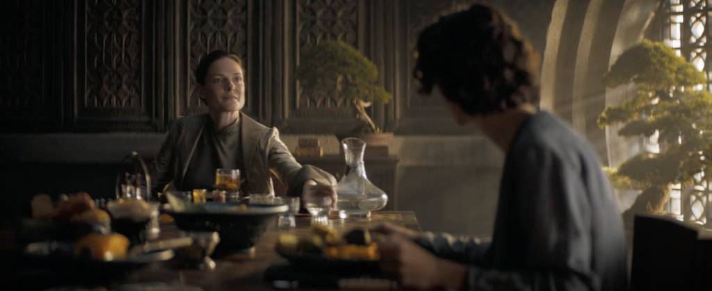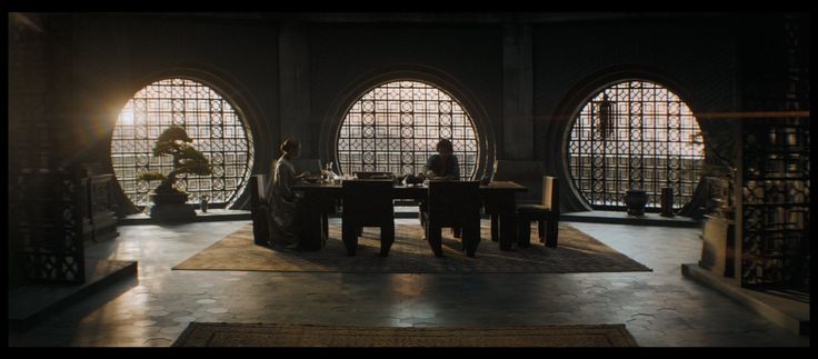On retrouve donc la même salle, des proportions assez semblables et un mobilier légèrement différent car on a pas forcement le même Ikea sur Caladan. Mais les marqueurs principaux sont là ; les fenêtres rondes avec les ouvertures en bois, le tapis, les arbres en pot etc…